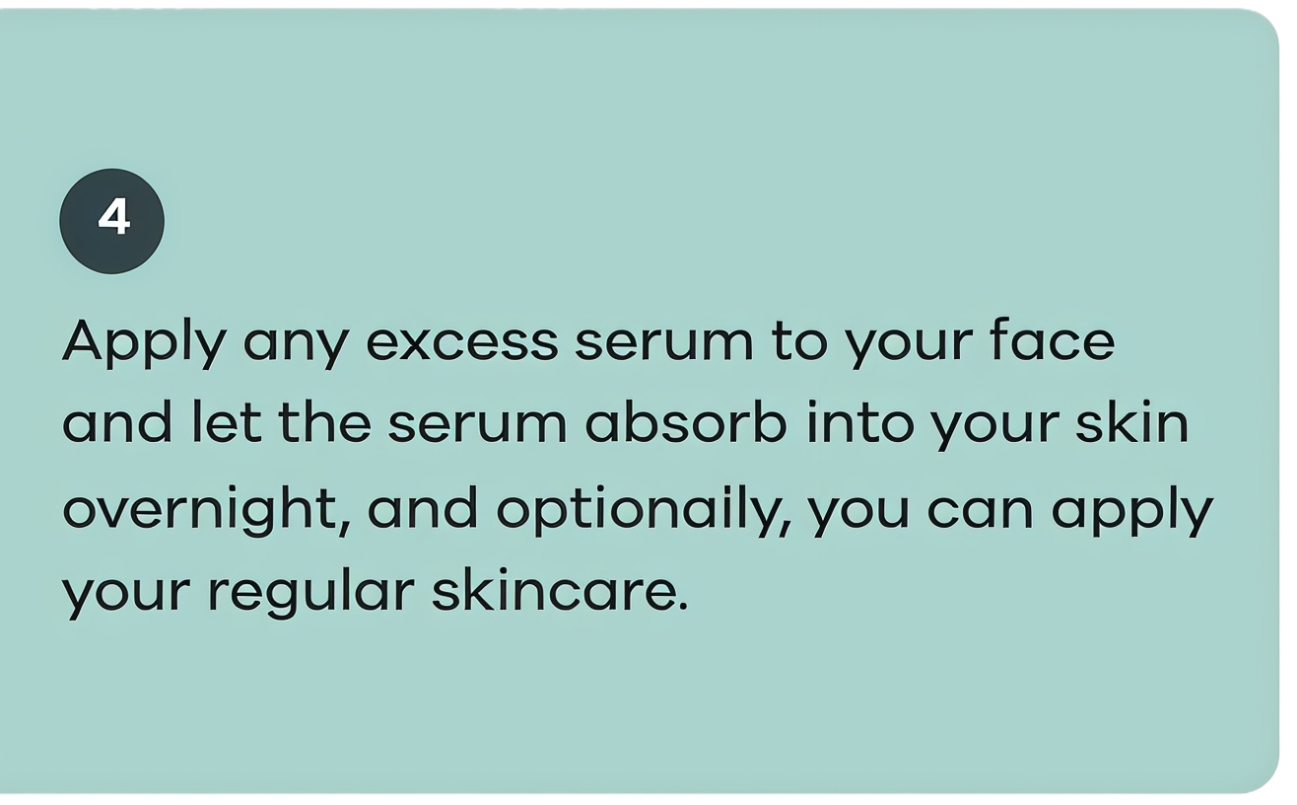 Apply any excess serum to your face and let the serum absorb into your skin overnight, and optionally, you can apply your regular skincare.